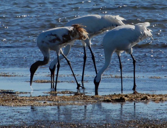 The water in the bay was down and these birds were on a sand spit. This is the closest I have ever been to the Whoopers.