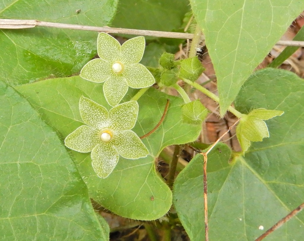 I photographed the first one I ever saw and later found out what it was named. It is in the Milkweed family of plants (Asclepiadaceae) and grows in Central and Eastern Texas. It is a Milkweed Pearl Vine (Matelea reticulata). When I see them I point them out to whoever I am with. They are small and can be easily overlooked.