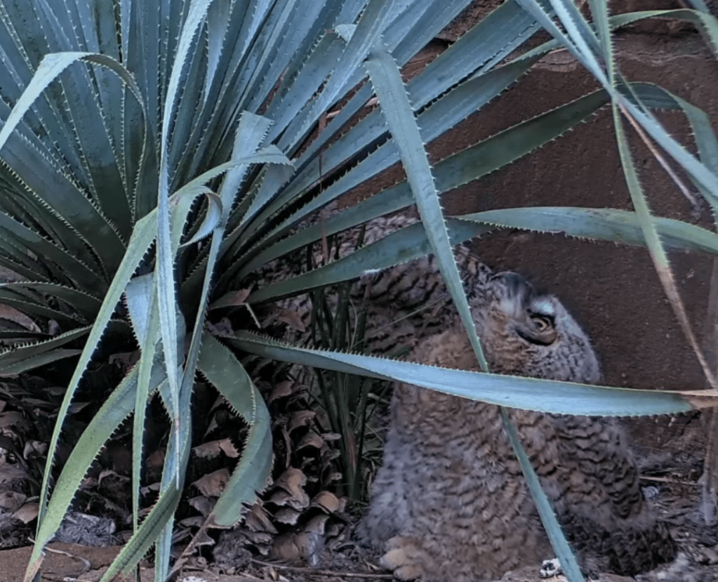 May 16- I visit the Wildflower Center for a volunteer shift and see the owlet up in the nest on the left side of the plant, on the ledge and cheeping.