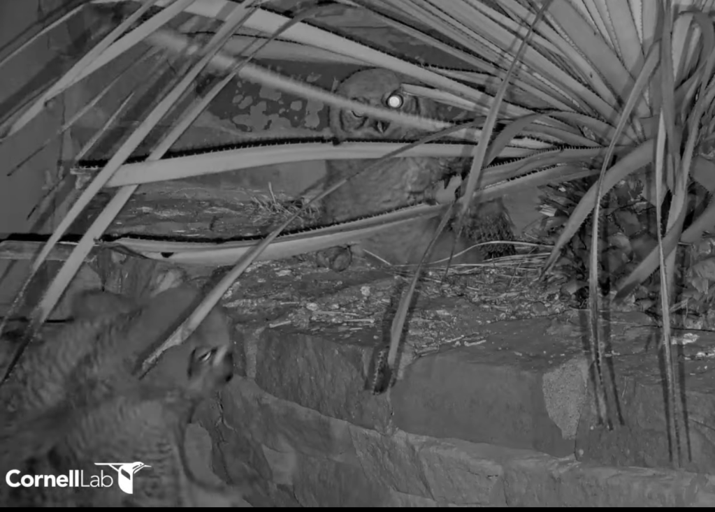 May 19- 7:20 a.m. He fledged! The camera was again at wide angle. He flew to a wall by the nearby pond and then went into some plants behind the pond. Then a parent bird showed up on the edge of the pond and flew off with a carcass in it’s talons, as if it was saying “Follow me!”