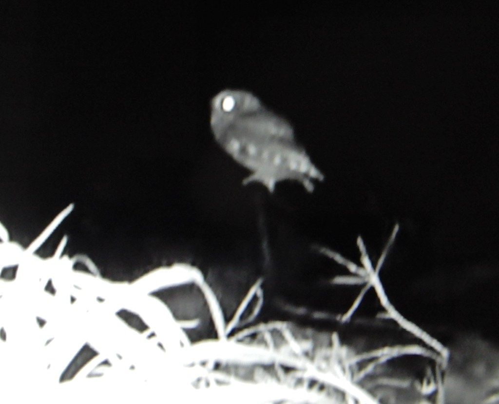 May 18-In the evening there is a party event (probably a wedding) and the little owl was panting some and moving around nest area. Music and toads could be heard. At 10:54 p.m. the owl was sitting on the left side of the nest area, waiting. All of a sudden a loud human yelling began and photo flashes illuminated the area, including the nest area. The startled owl moved behind the plant as the wedding party finished their business. He was back out a half an hour later and I captured this photo.