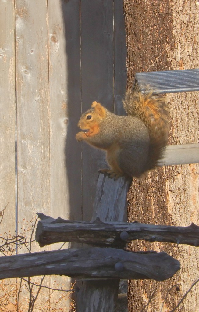 I am also thankful that the squirrel was not dead or paralyzed, which is what I thought when I first saw it outside my kitchen window. That first glance told me it was dead…had somehow ended up there and slowly died in that position. I went outside to get a better look and a photo and low and behold, an eye opened and then closed again. I thought “Oh No! It is paralyzed!” seeing the back legs hanging and not moving. So, I went inside and got a cardboard box and my “grabber” (device for picking up things from 3 feet away). I was already planning on taking it to the local Wildlife Rescue place. As I approached, the squirrel moved it’s head and I backed up and went back in the house and watched as it scampered up a tree seemingly uninjured.